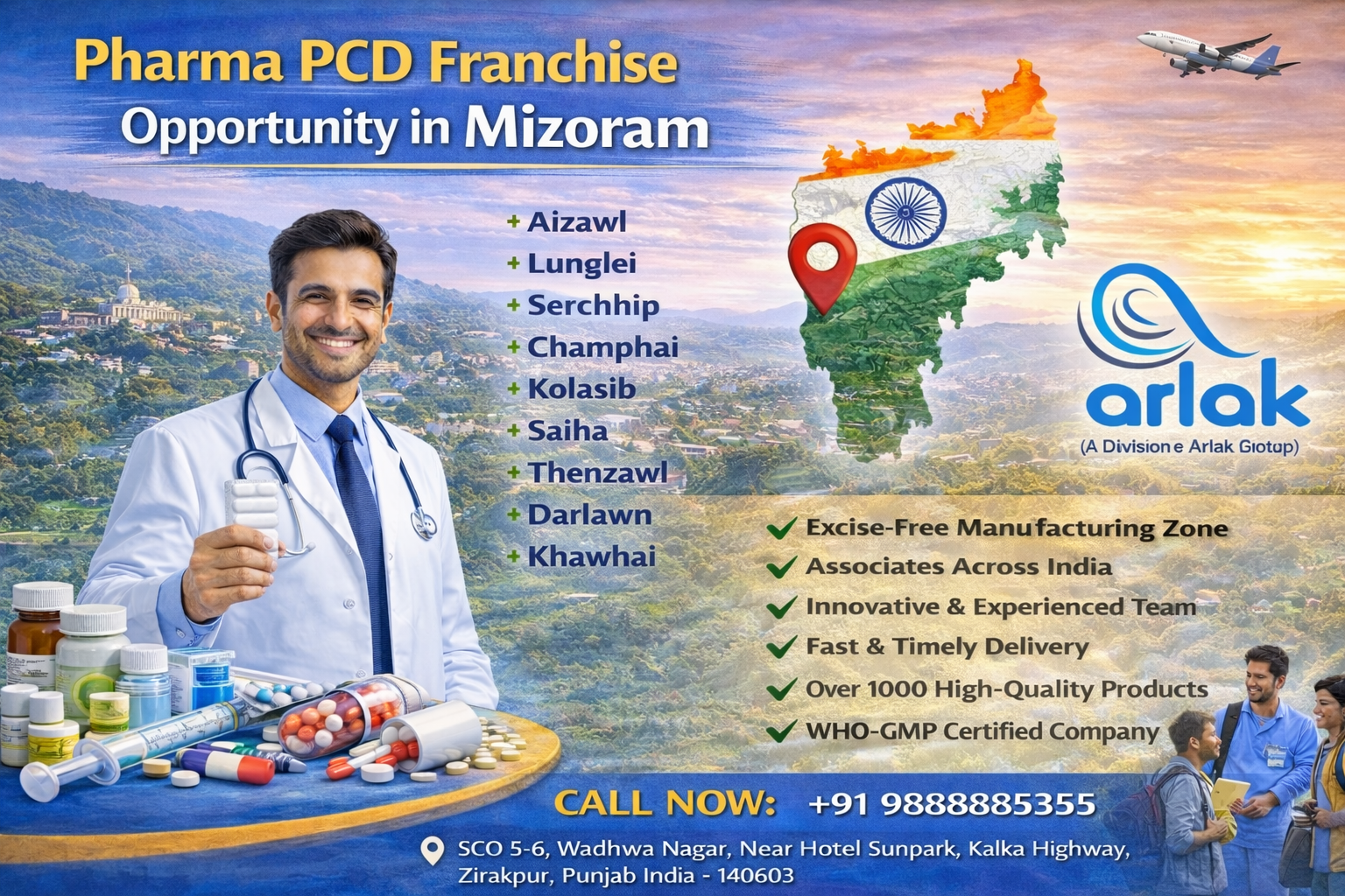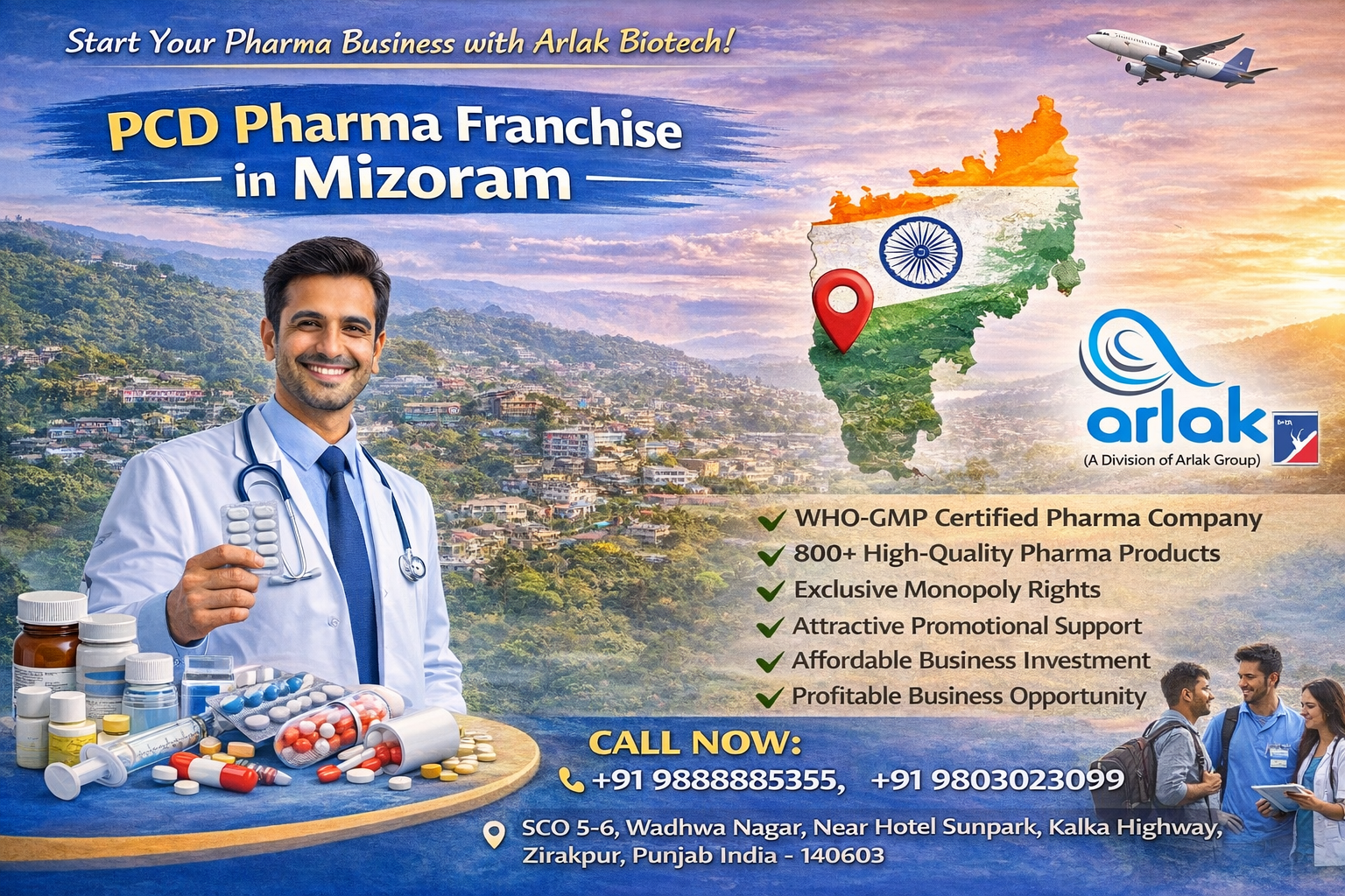 Arlak Biotech is now in Mizoram, we are providing PCD Pharma Franchise in Mizoram we invite distributors, market representatives, stakeholders, and pharma dealers from all districts of Mizoram (like Aizawl, Lunglei, Serchhip, Champhai, Kolasib, Saiha, Thenzawl, Darlawn, etc) to be our partner. We have a variety of pharma products in a very attractive range. If you want to invest in something good, want to have profit, and want your business to run successfully all you need to do is call us at +91-9888885355 for a PCD Pharma Franchise in Mizoram.
