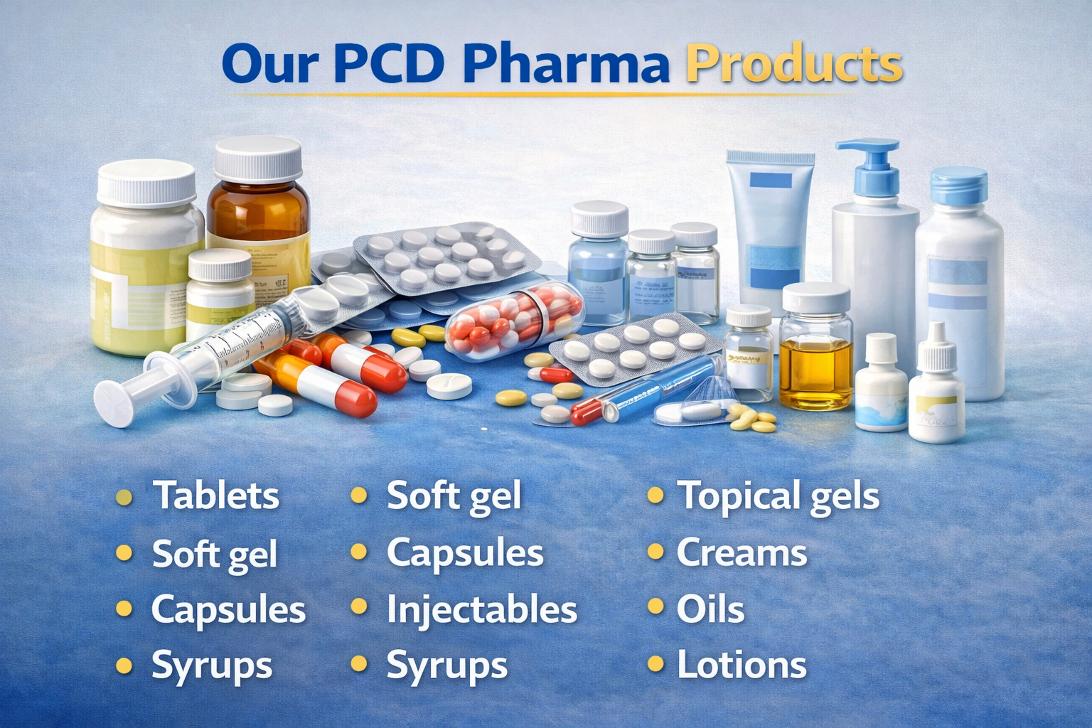 Tablets, capsules, softgels, injectables, syrups, creams, gels, oils, lotions, and drops.