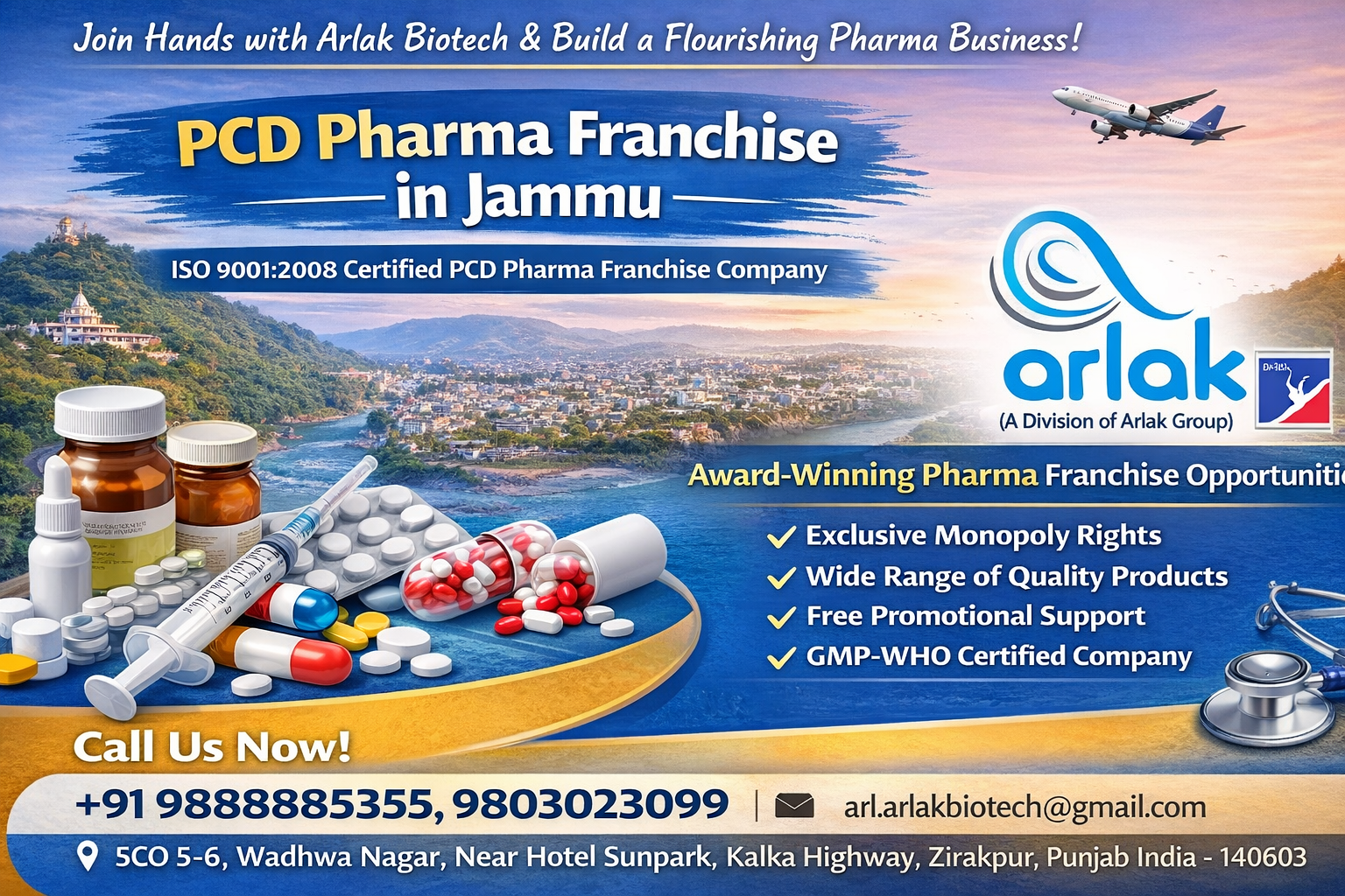 For more details regarding PCD Pharma Franchise, you can give us a call at +91-9888885355, or 9803023099. Know more about our product price list for the franchise in Jammu along with other business facilities and requirements to set up your own growing franchise in Jammu for pharma PCD Franchise. Arlak Biotech is one ideal name for the pharmaceutical business in India.