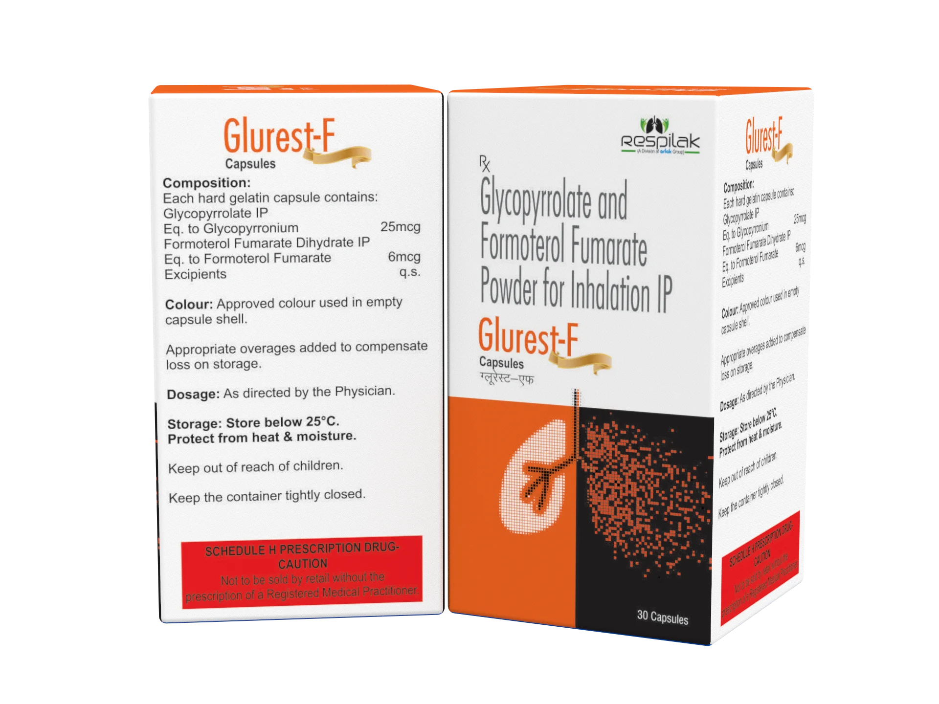 GLUREST–F Capsules are a dual bronchodilator formulation combining Glycopyrrolate, a long-acting muscarinic antagonist (LAMA), and Formoterol Fumarate, a long-acting β₂-adrenergic agonist (LABA). This combination is specifically designed for the maintenance treatment of chronic obstructive pulmonary disease (COPD), including chronic bronchitis and emphysema.