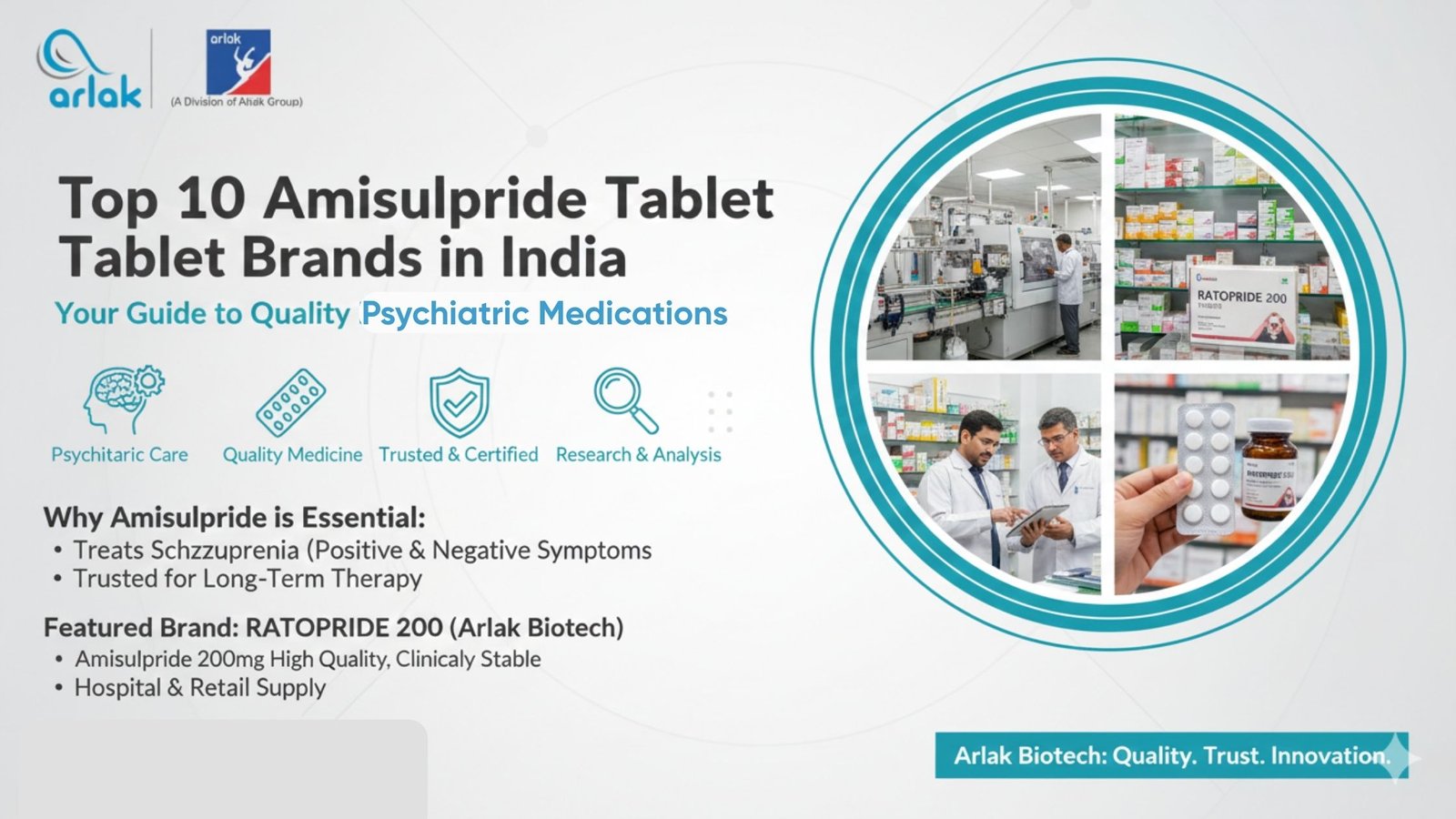 Arlak Biotech presents to you RATOPRIDE 200 Tablets the best from Top 10 Amisulpride Tablet Brands in India, and the best Amisulpride 200 mg formulation. This is a premium brand of Amisulpride drug therapy in which the dose is raised to meet the needs of patients with moderate to severe schizophrenia. By maintaining its quality-control standards, Arlak Biotech is able to guarantee potency, safety, and therapeutic effectiveness with every batch of the product.